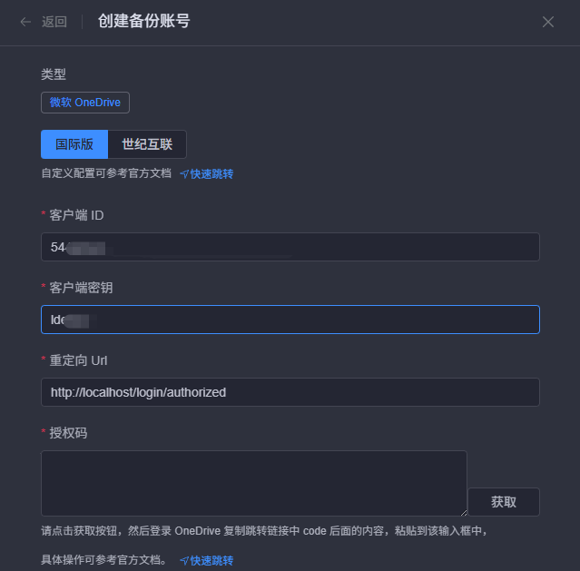 后来想想,我的1Panel上不也是在用嘛,那个都能正常使用没报错,去拷个密钥来替换一下不就好了,马上走起>>>>,来到1Panel的备份账号里,添加一个Onedrive,马上就能看到我想要的东西: