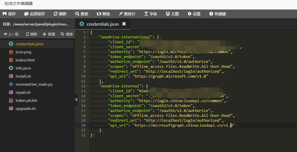 于是把客户端ID和客户端密钥Copy下来,再来到宝塔面板的文件中,找到Onedrive插件的目录:/www/server/panel/plugin/msonedrive/credentials.json,打开这个文件,在onedrive-international里修改相应的参数保存一下: